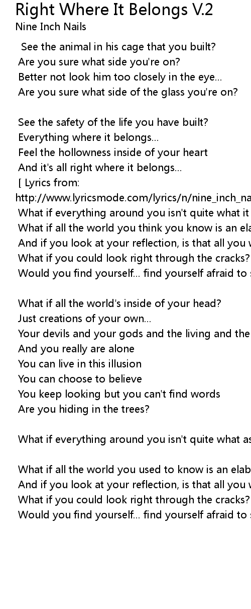 [ Lyrics from: http://www.lyricsmode.com/lyrics/n/nine_inch_nails/right_where_it_belongs.html ]