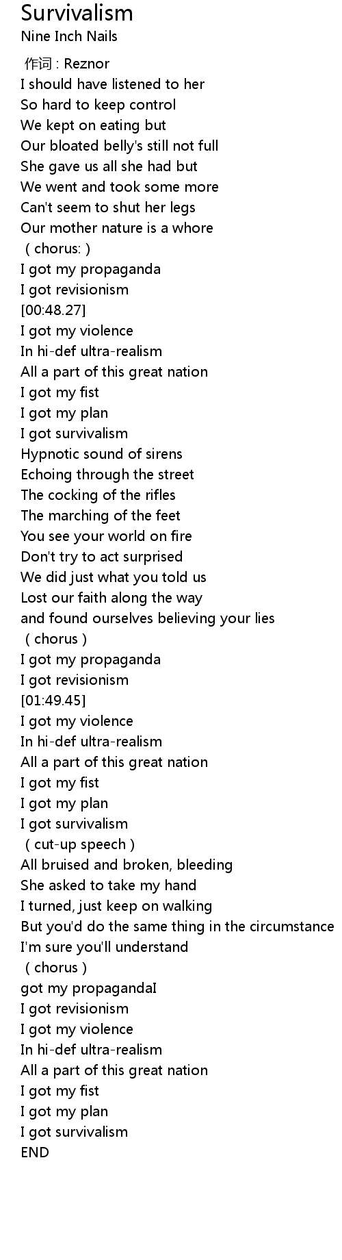 | [01:09.12] | I got survivalism |