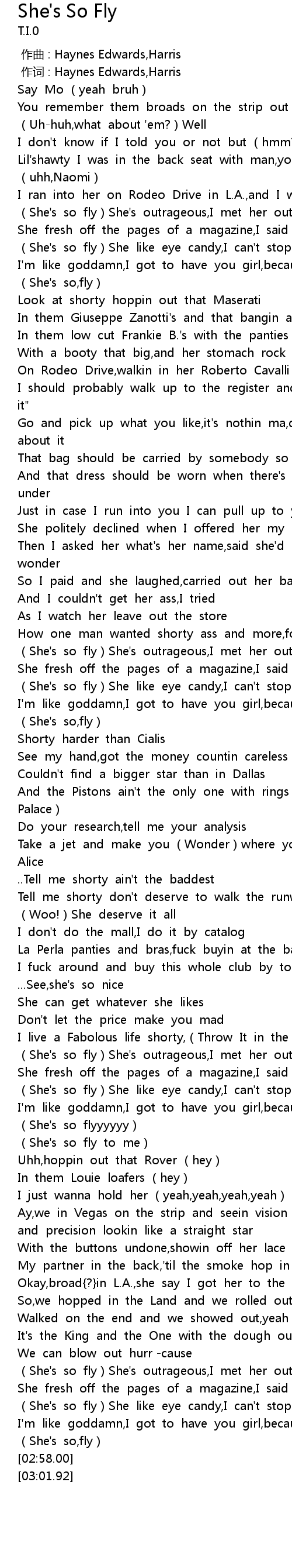 | [01:58.94] | (She's so fly)She like eye candy,I can't stop starin |