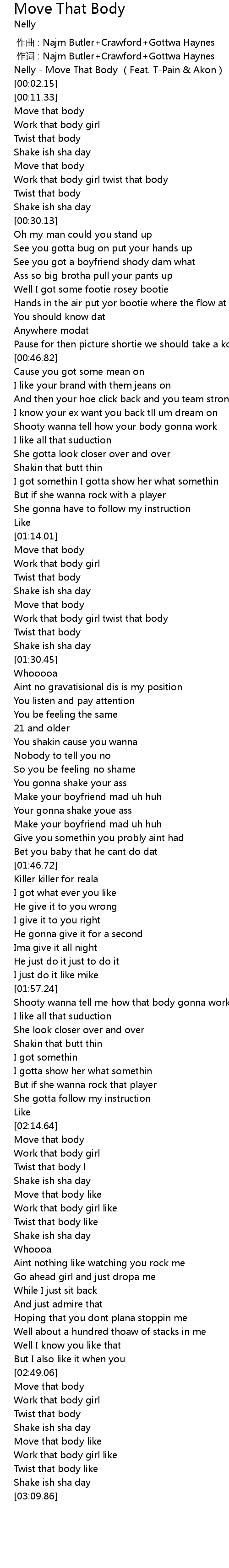 | [00:01.09] | Nelly - Move That Body (Feat. T-Pain & Akon) |