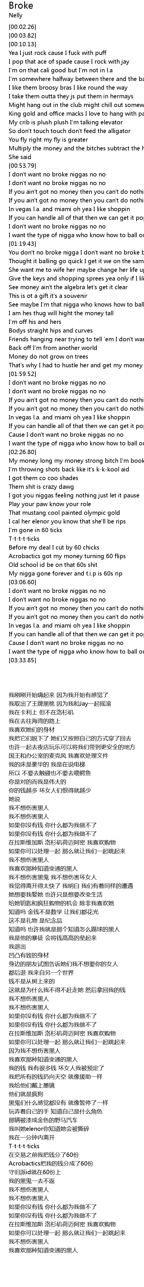 | [02:00.02] | I don't want no broke niggas no no |
