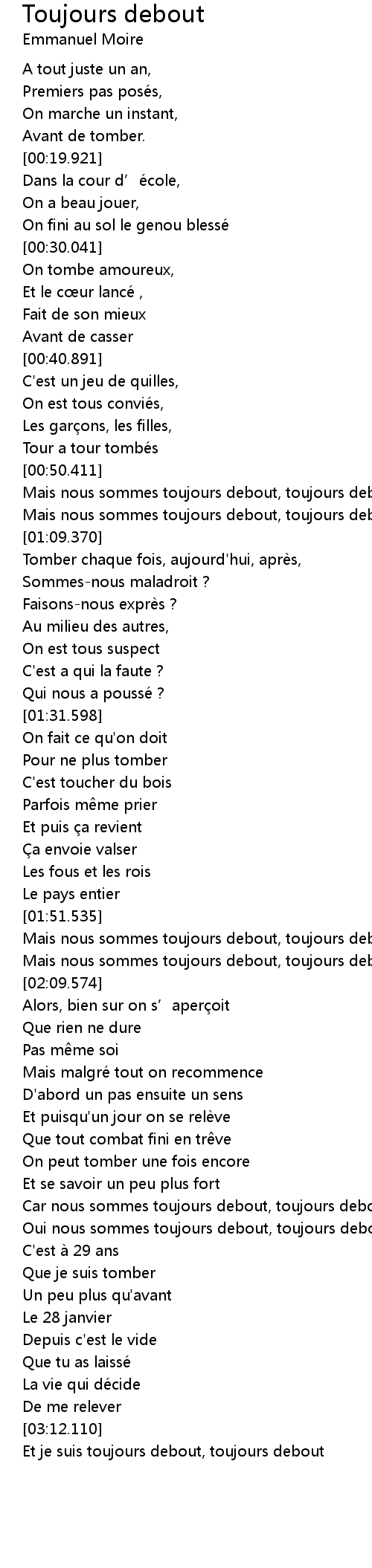 | [00:51.281] | Mais nous sommes toujours debout, toujours debout. |