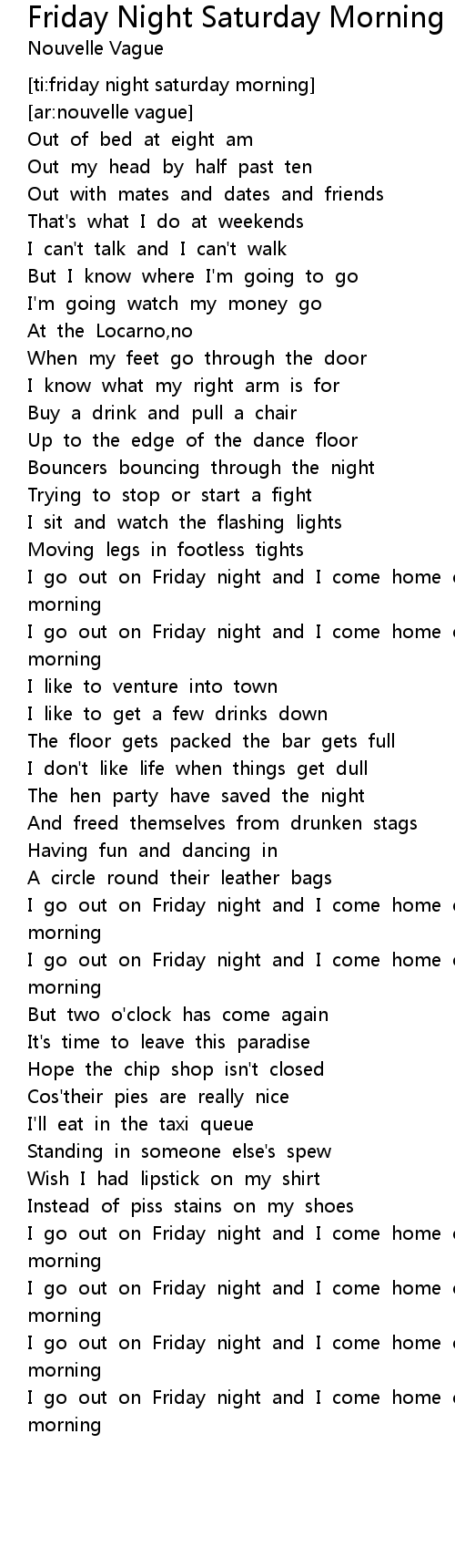[02:23.201] I go out on Friday night and I come home on Saturday morning