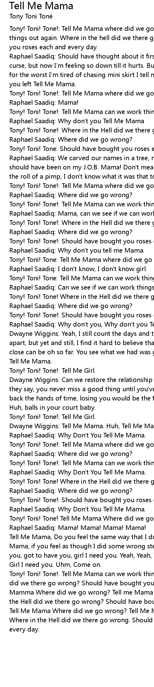 Tony! Toni! Tone!: Tell Me Mama can we work things out again? Where in the Hell did we there go wrong? Should have bought you roses each and every day. Tell me Mamma Where did we go wrong? Tell me Mama Can We work things out again. Where in the Hell did we there go wrong? Should have bought you roses each and everyday. Tell Me Mama Where did we go wrong? Tell Me Mama Can we work things out again? Where in the Hell did we there go wrong. Should have bought you roses each and every day. |