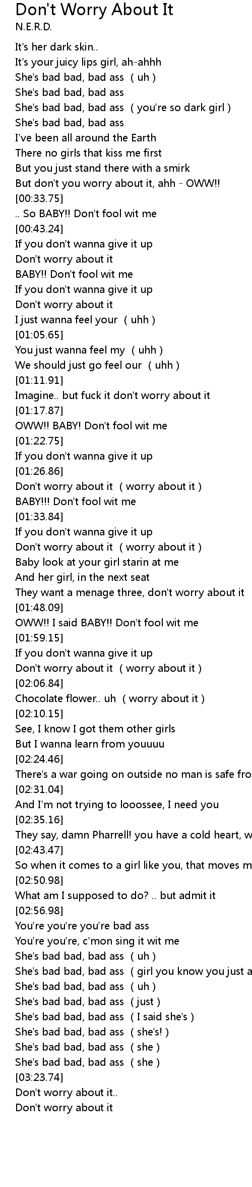| [02:03.78] | Don' t worry about it worry about it |