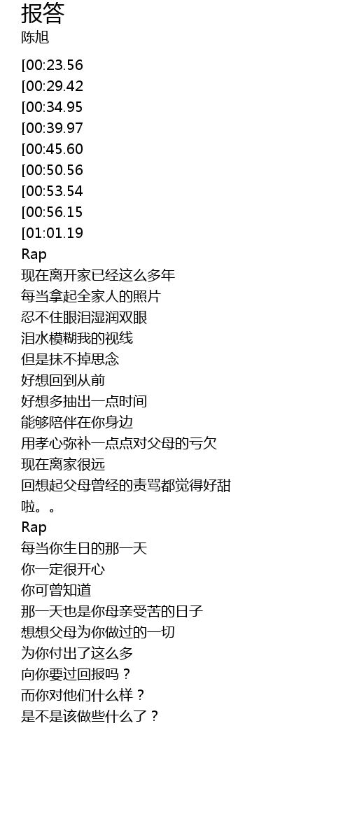 | [02:22.85][00:56.15] | 不忍父母再为我付出任何代价 |