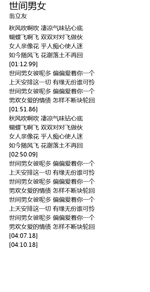 | [01:23.31] | 上天安排这一切 有缘无份谁可怜 |