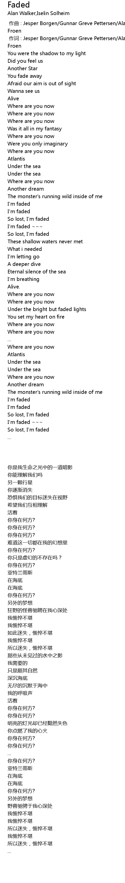 | [00:01.00] | 作词 : Jesper Borgen/Gunnar Greve Pettersen/Alan Walker/Anders Froen |