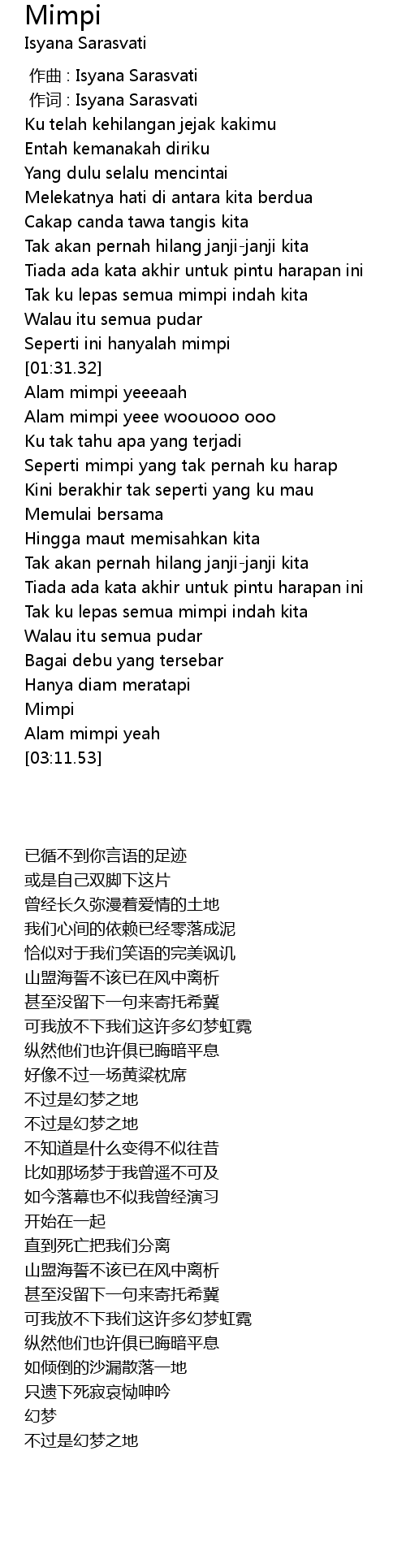 | [01:39.19] | Alam mimpi yeee woouooo ooo |
