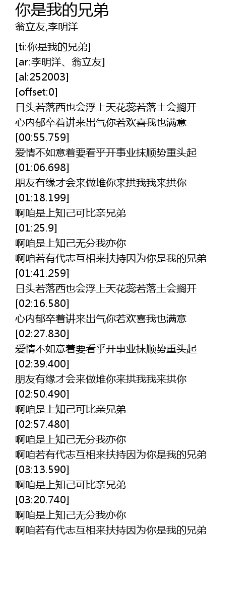 | [03:26.990] | a zán ruò yǒu dài zhì hù xiāng lái fú chí yīn wèi nǐ shì wǒ de xiōng dì |