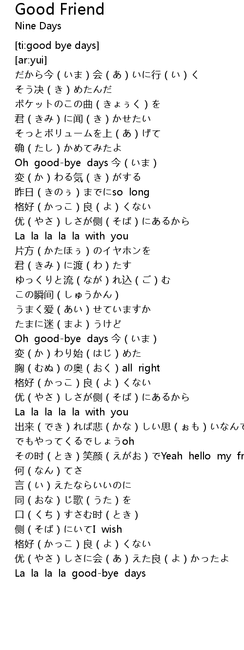 | [03:09.205] | その时(とき)笑颜(えがお)でYeah hello my friends 何(なん)てさ |