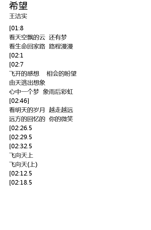 | [01:1.5][02:32.5] | 希望的翅膀 一天中张开 |