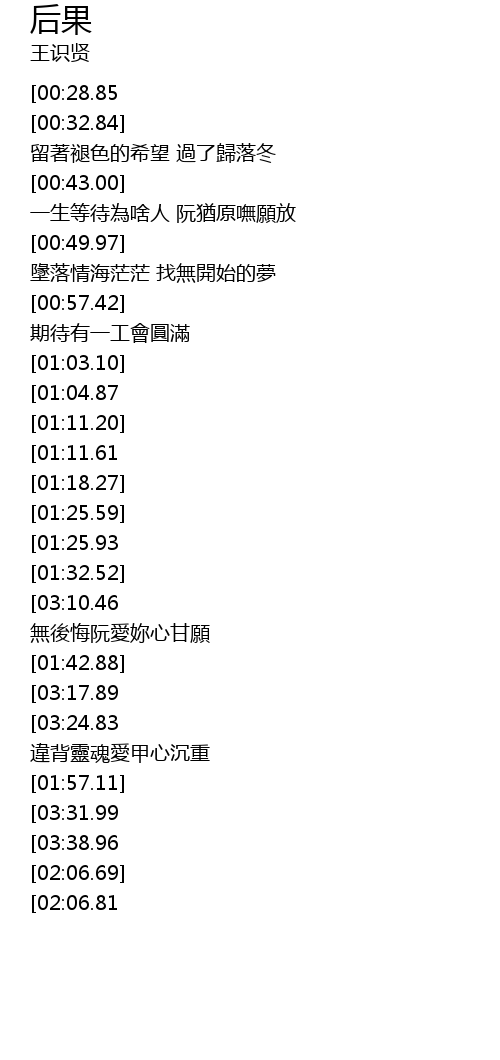 | [03:53.03][03:17.89][01:43.06] | 付出的一切有多重 全部的後果阮承擔 |