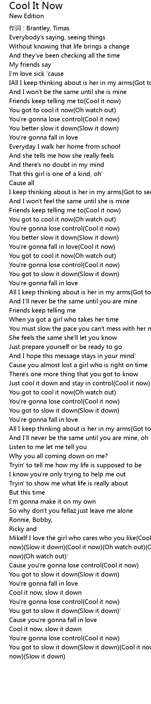 | MikeIf I love the girl who cares who you like Cool it now Oh watch out Cool it now Slow it down Cool it now Oh watch out Cool it now Slow it down Cool it now Oh watch out' | |