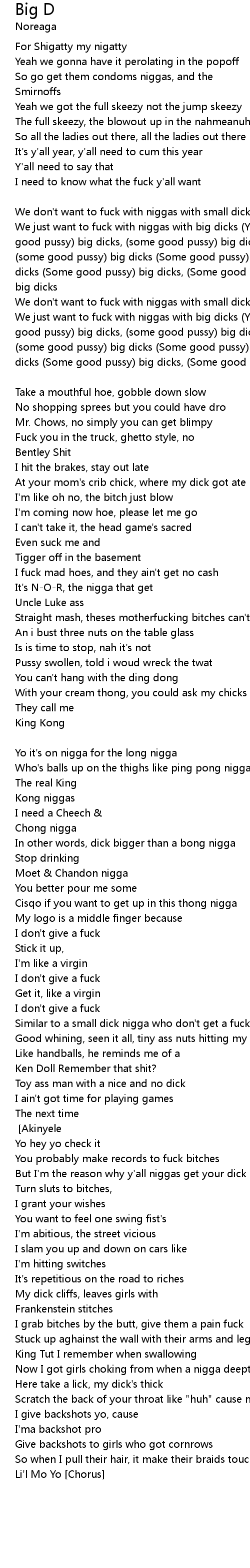 We just want to fuck with niggas with big dicks (Yeah that's us) (I want some good pussy) big dicks, (some good pussy) big dicks, (Some good pussy) big dicks, (some good pussy) big dicks (Some good pussy) big dicks, (some good pussy) big dicks (Some good pussy) big dicks, (Some good pussy) big dicks (Some good pussy) big dicks [N.O.R.E.] |