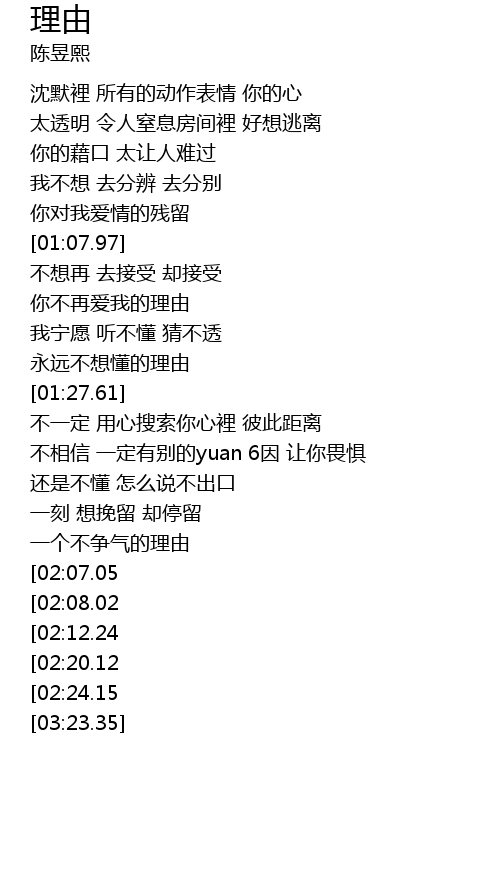 | [03:00.21][02:12.24] | 你要离开我的理由 |