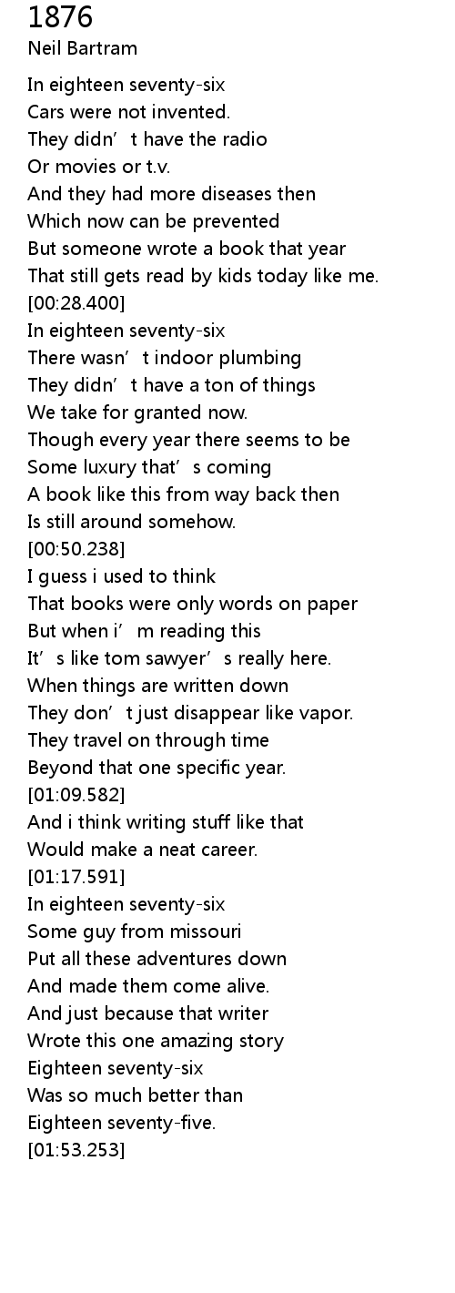 | [01:38.771] | Eighteen seventy-six |