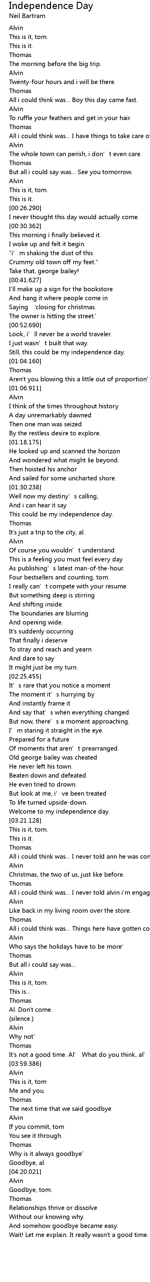 | [00:59.111] | Still, this could be my independence day. |