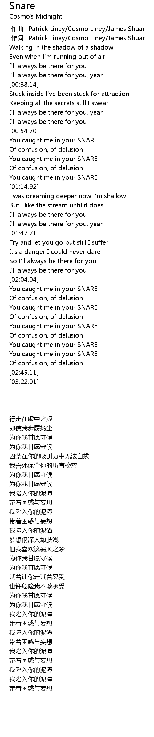 | [00:01.00] | 作词 : Patrick Liney/Cosmo Liney/James Shuar |