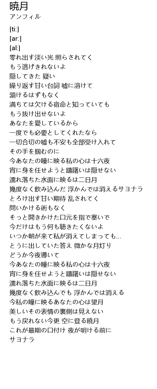 | [03:05.30] | 濡れ落ちた水面に映るは二日月 |