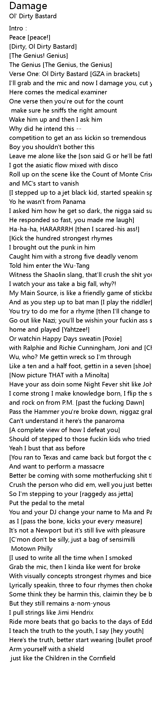 | Verse One: Ol Dirty Bastard [GZA in brackets] | |