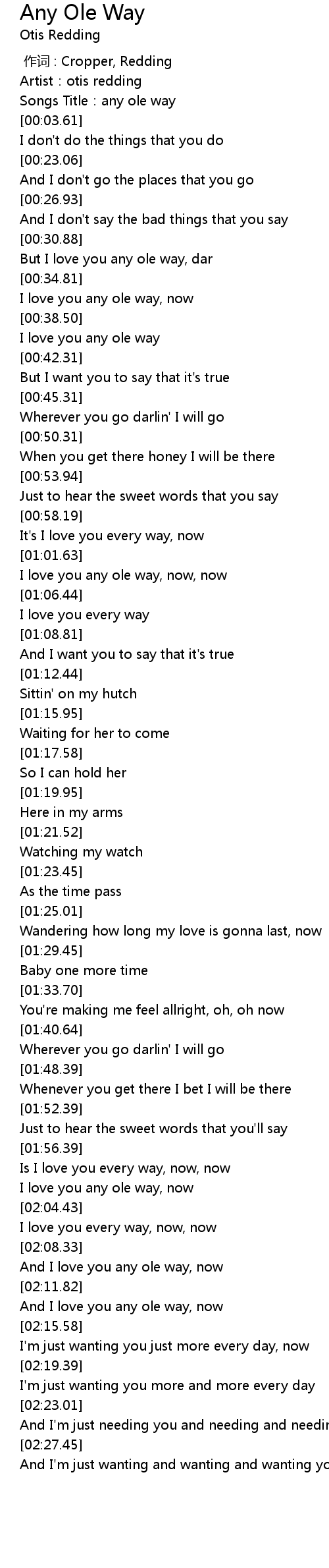 | [02:01.06] | I love you any ole way, now |