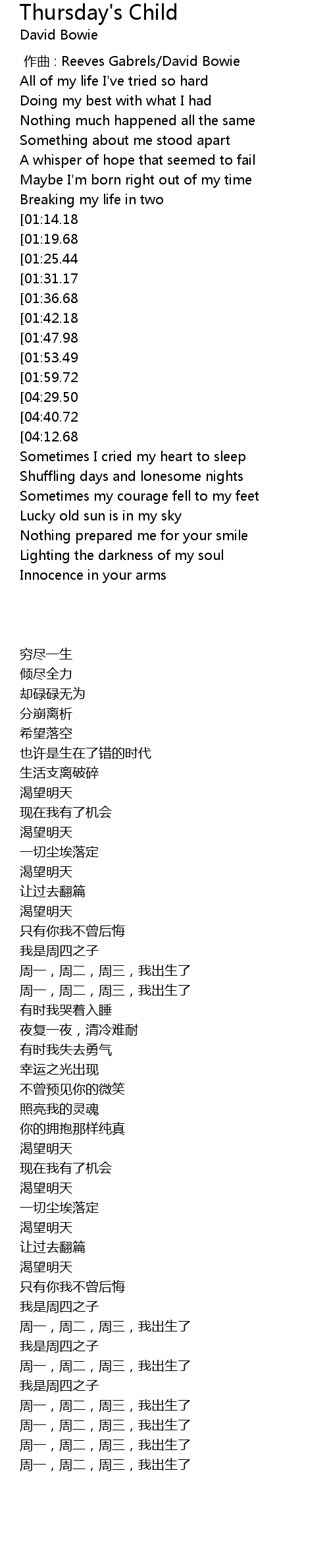| [04:00.23][01:59.72] | That I was Thursday's child |