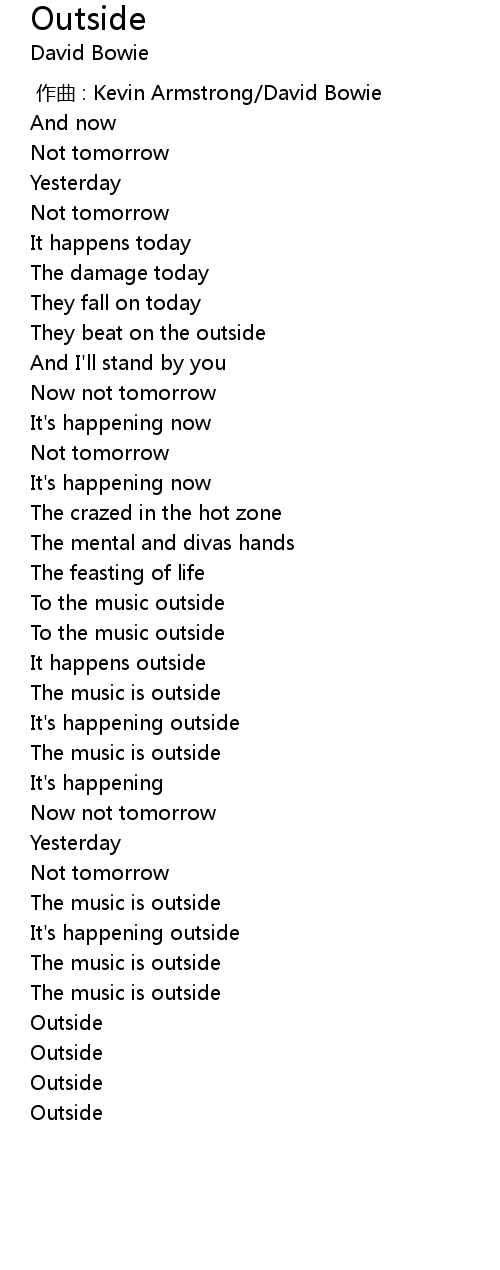 | [00:00.00] | 作曲 : Kevin Armstrong/David Bowie |