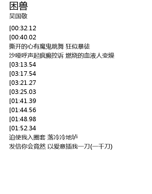 | [01:25.95][00:32.12] | 似只困兽再次挣扎着 拼发我倾慕 |
