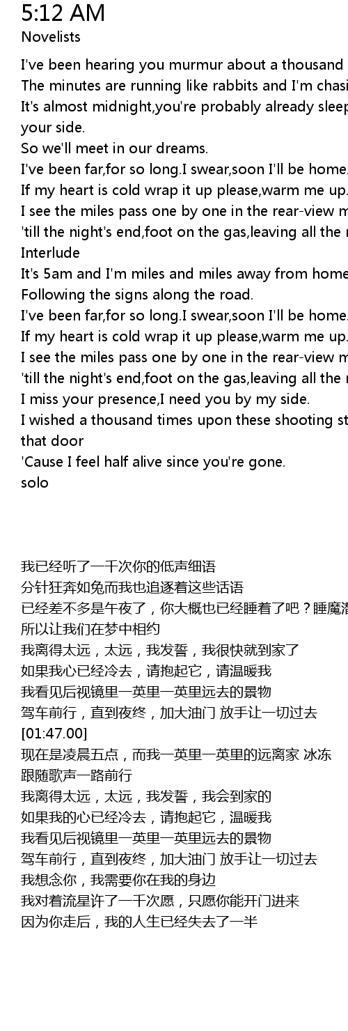 | [02:15.47] | It's 5am and I'm miles and miles away from home..frozen. |