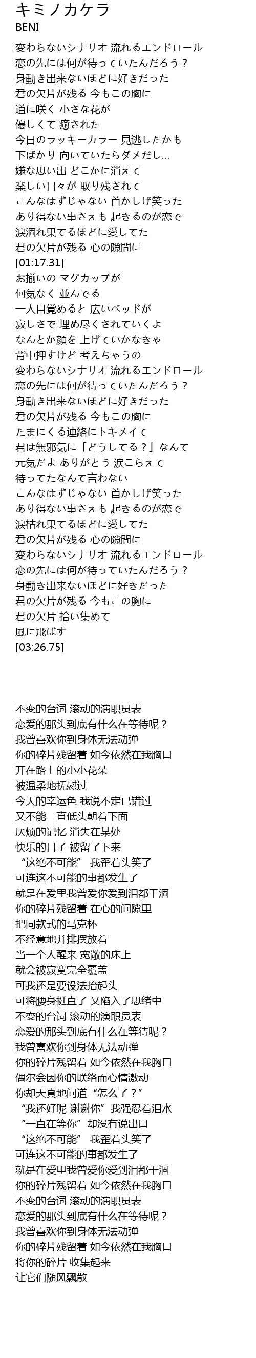 | [00:17.15] | 君の欠片が残る 今もこの胸に |