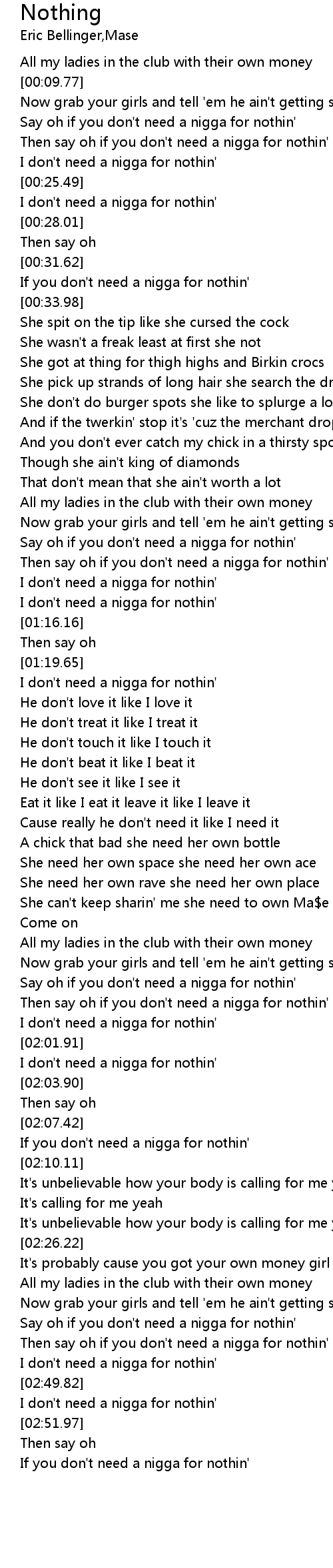 [02:56.36] If you don't need a nigga for nothin'
