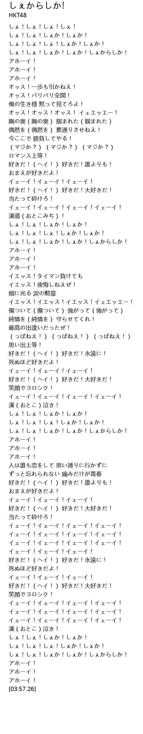 | [03:41.09] | しぇ!しぇ!しぇか!しぇか!しぇからしか! |