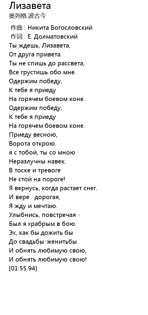 | [00:09.75] | Ты ждешь, Лизавета, |