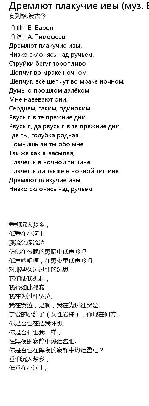 | Song | Дремлют плакучие ивы (муз. Б.Барона, сл. А.Тимофеева) |