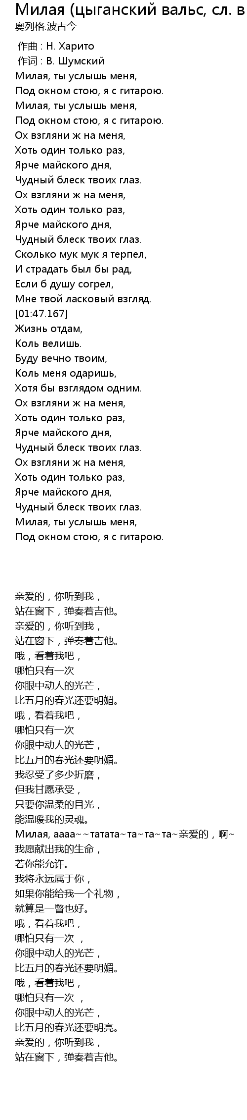 | Song | Милая (цыганский вальс, сл. в обработке С.Герделя) |