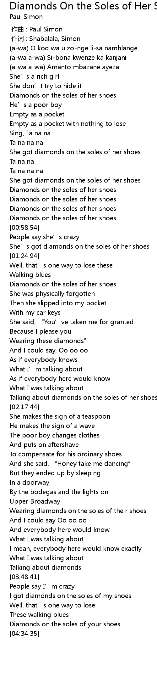 | [00:53.38] | Diamonds on the soles of her shoes |