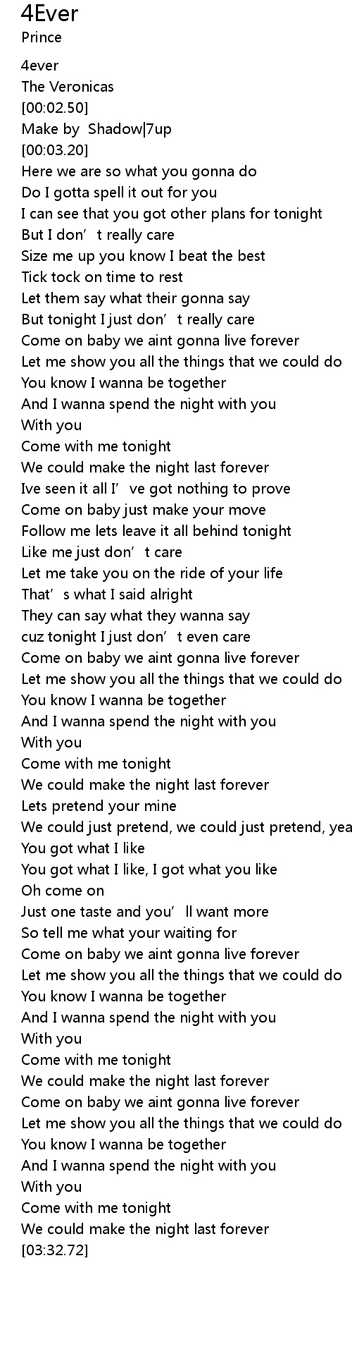 | [02:58.00] | Come on baby we aint gonna live forever |