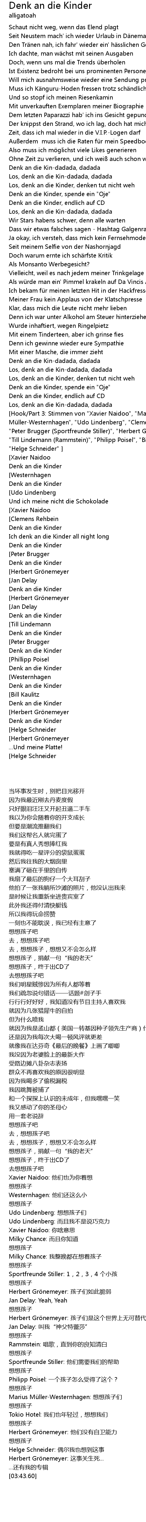 | [02:25.51][Hook/Part 3: Stimmen von "Xavier Naidoo", "Marius Müller-Westernhagen", "Udo Lindenberg", "Clemens Rehbein (Milky Chance)", "Peter Brugger (Sportfreunde Stiller)", "Herbert Grönemeyer", "Jan Delay", "Till Lindemann (Rammstein)", "Philipp Poisel", "Bill Kaulitz (Tokio Hotel)" & "Helge Schneider" ] | |