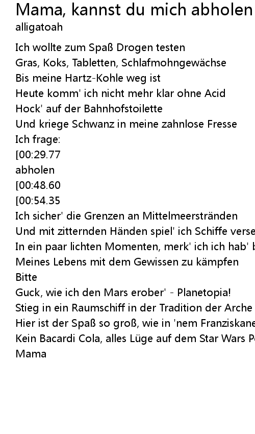 | [00:24.15][00:29.77][00:46.40][00:51.70][01:08.25][01:13.78] | Mama, kannst du mich abholen |