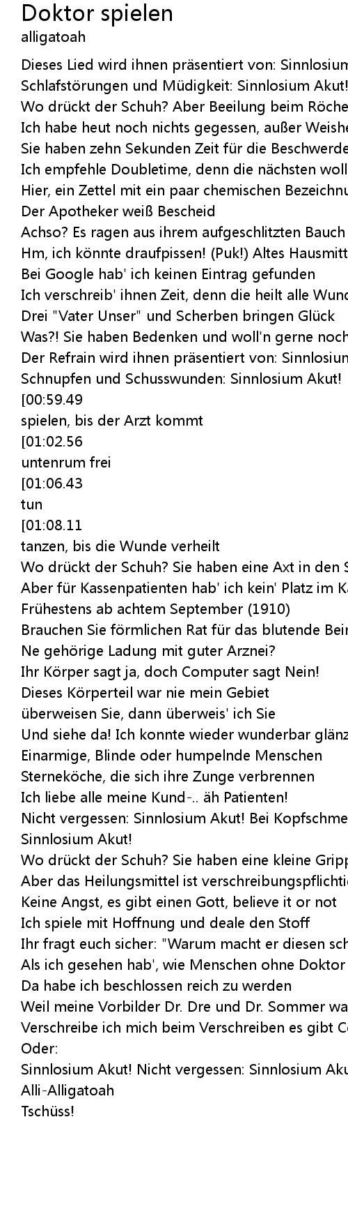 | [01:17.56] | Aber fü r Kassenpatienten hab' ich kein' Platz im Kalender |