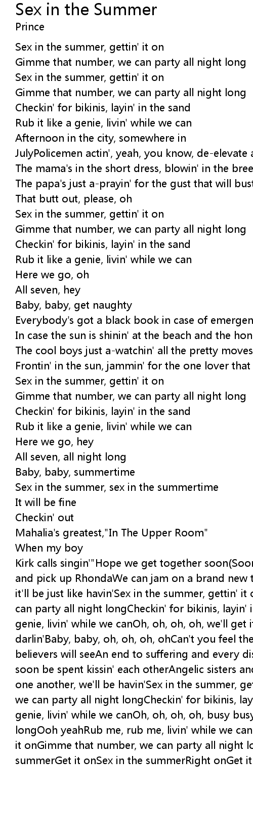 Kirk calls singin'"Hope we get together soon(Soon, soon)We can fire up the Honda and pick up RhondaWe can jam on a brand new tuneImprovise all through the night, it'll be just like havin'Sex in the summer, gettin' it onGimme that number, we can party all night longCheckin' for bikinis, layin' in the sandRub it like a genie, livin' while we canOh, oh, oh, oh, we'll get it onAll seven, party, darlin'Baby, baby, oh, oh, oh, ohCan't you feel the new day dawning? All believers will seeAn end to suffering and every diseaseEvery waking hour will soon be spent kissin' each otherAngelic sisters and brothersClap your hands for one another, we'll be havin'Sex in the summer, gettin' it onGimme that number, we can party all night longCheckin' for bikinis, layin' in the sandRub it like a genie, livin' while we canOh, oh, oh, oh, busy busyGive it to me all night longOoh yeahRub me, rub me, livin' while we can, babySex in the summer, gettin' it onGimme that number, we can party all night longSex in the summerSex in the summerGet it onSex in the summerRight onGet it on |