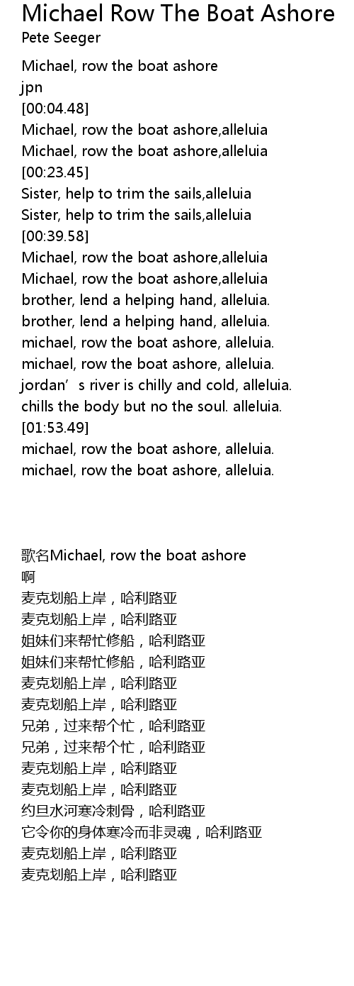 | [00:40.11] | Michael, row the boat ashore, alleluia |