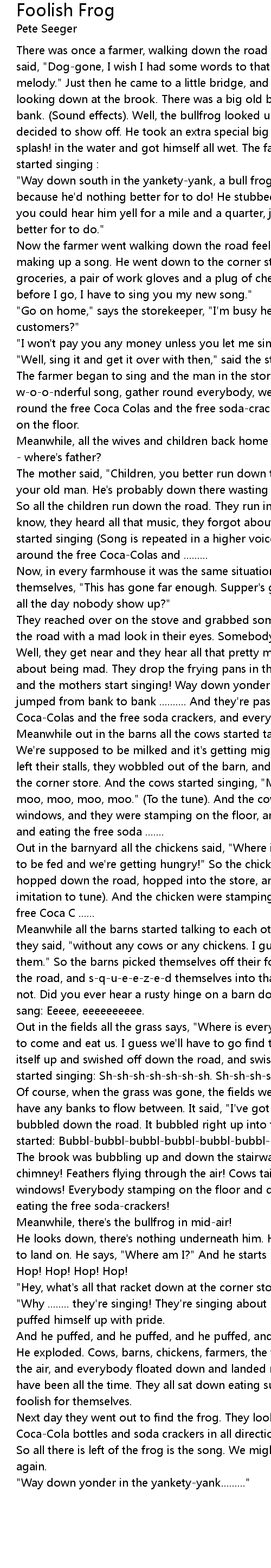 "Way down south in the yankety-yank, a bull frog jumped from bank to bank, just because he'd nothing better for to do! He stubbed his toe and fell in the water; you could hear him yell for a mile and a quarter, just because he'd nothing better for to do." |