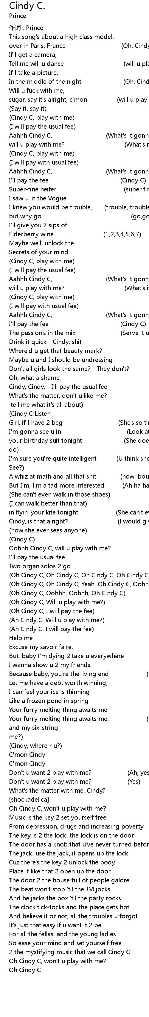 | (Oh Cindy C, Oh Cindy C, Yeah, Oh Cindy C, Oohhh Cindy C) | |