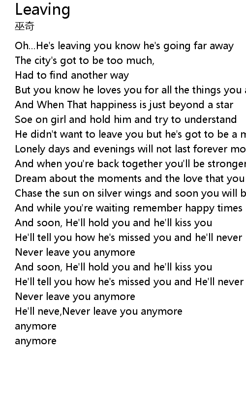 | [00:01.39] | Oh...He's leaving you know he's going far away |
