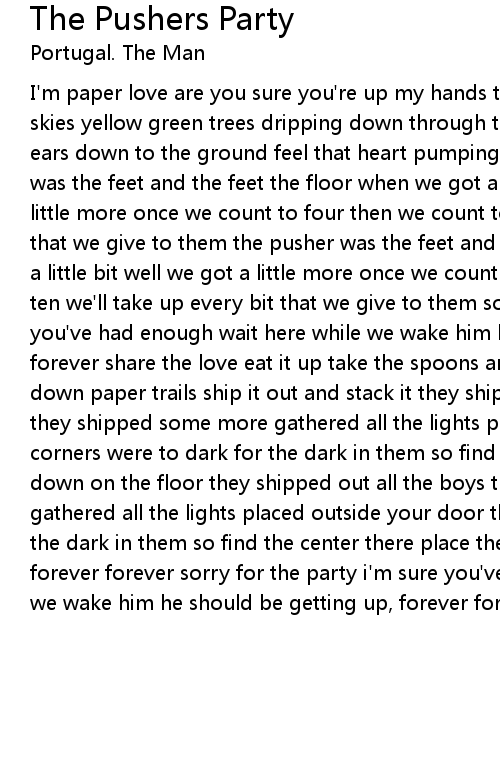 I'm paper love are you sure you're up my hands the sun mouth your love purple skies yellow green trees dripping down through the colored streets press your ears down to the ground feel that heart pumping through the ground? the pusher was the feet and the feet the floor when we got a little bit well we got a little more once we count to four then we count to ten we'll take up every bit that we give to them the pusher was the feet and the feet the floor when we got a little bit well we got a little more once we count to four then we count to ten we'll take up every bit that we give to them sorry for the party i'm sure you've had enough wait here while we wake him he should be getting up, forever forever share the love eat it up take the spoons and dig it up find your way down paper trails ship it out and stack it they shipped out all the boys then they shipped some more gathered all the lights placed outside your door the corners were to dark for the dark in them so find the center there place them down on the floor they shipped out all the boys then they shipped some more gathered all the lights placed outside your door the corners were to dark for the dark in them so find the center there place them down on the floor ohhhhh forever forever sorry for the party i'm sure you've had enough wait here while we wake him he should be getting up, forever forever |