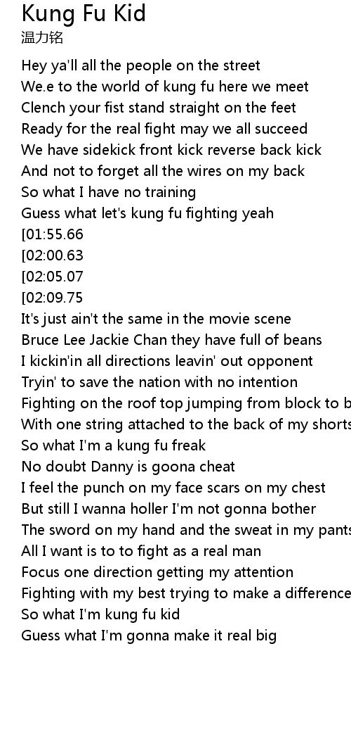 | [00:16.40] | We.e to the world of kung fu here we meet |