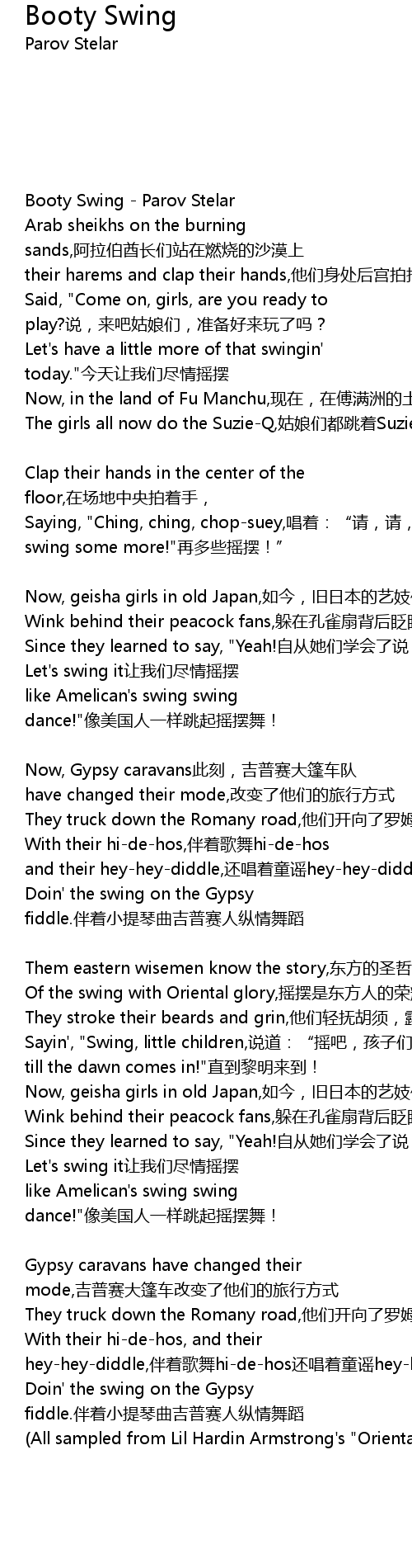 | [02:35.42] | Doin' the swing on the Gypsy fiddle. bàn zhe xiǎo tí qín qǔ jí pǔ sài rén zòng qíng wǔ dǎo |