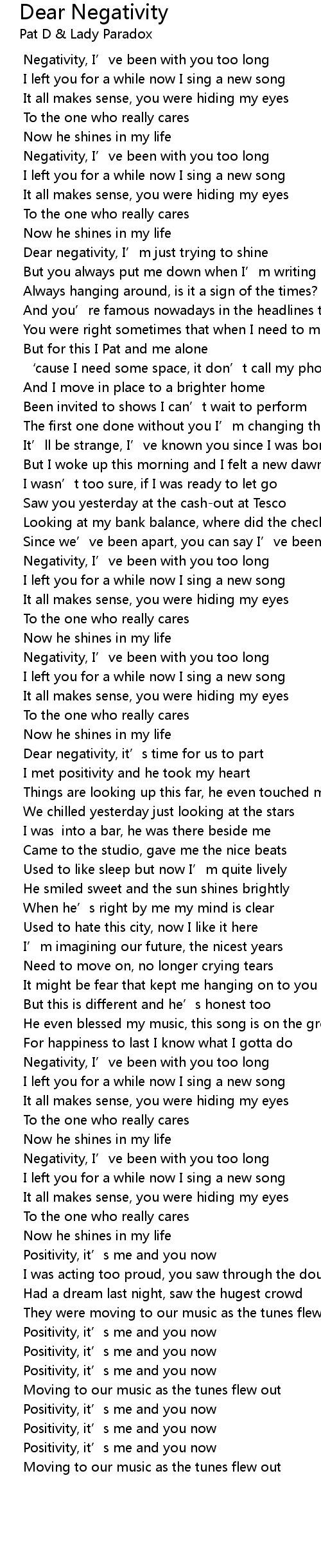 | [00:02.974] | Negativity, I’ve been with you too long |